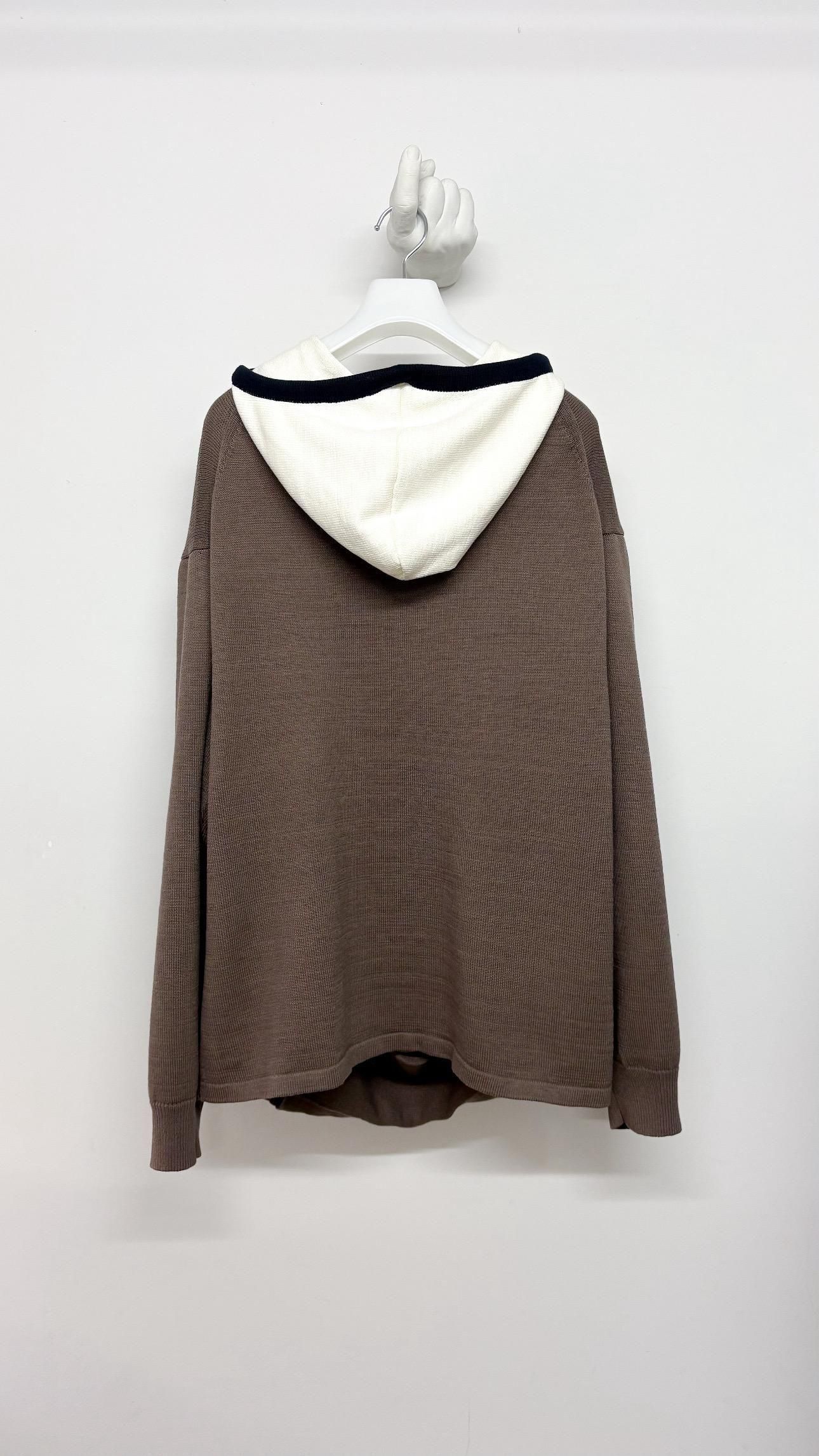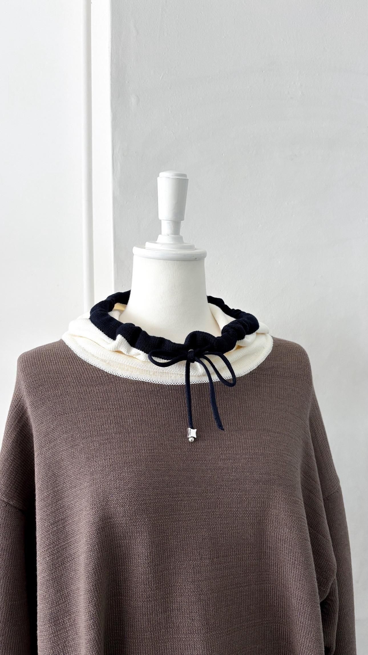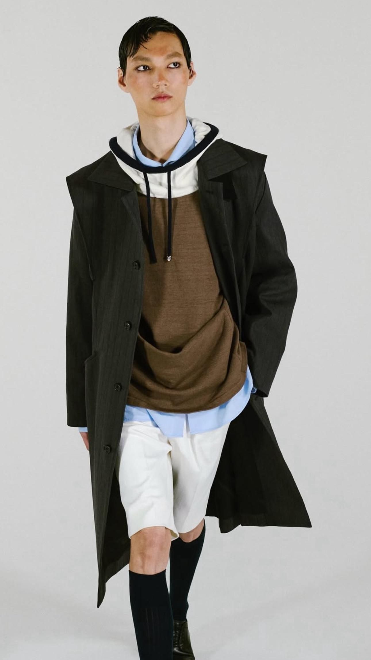 今シーズンのインスピレーション、舟越桂の彫刻にみられる、特徴的なネックラインや肩のラインを想像し、緩やかなドレープ感のあるネックライン、ポケットもカンガルーのような形で、自然とドレープが生まれるデザインになっています。