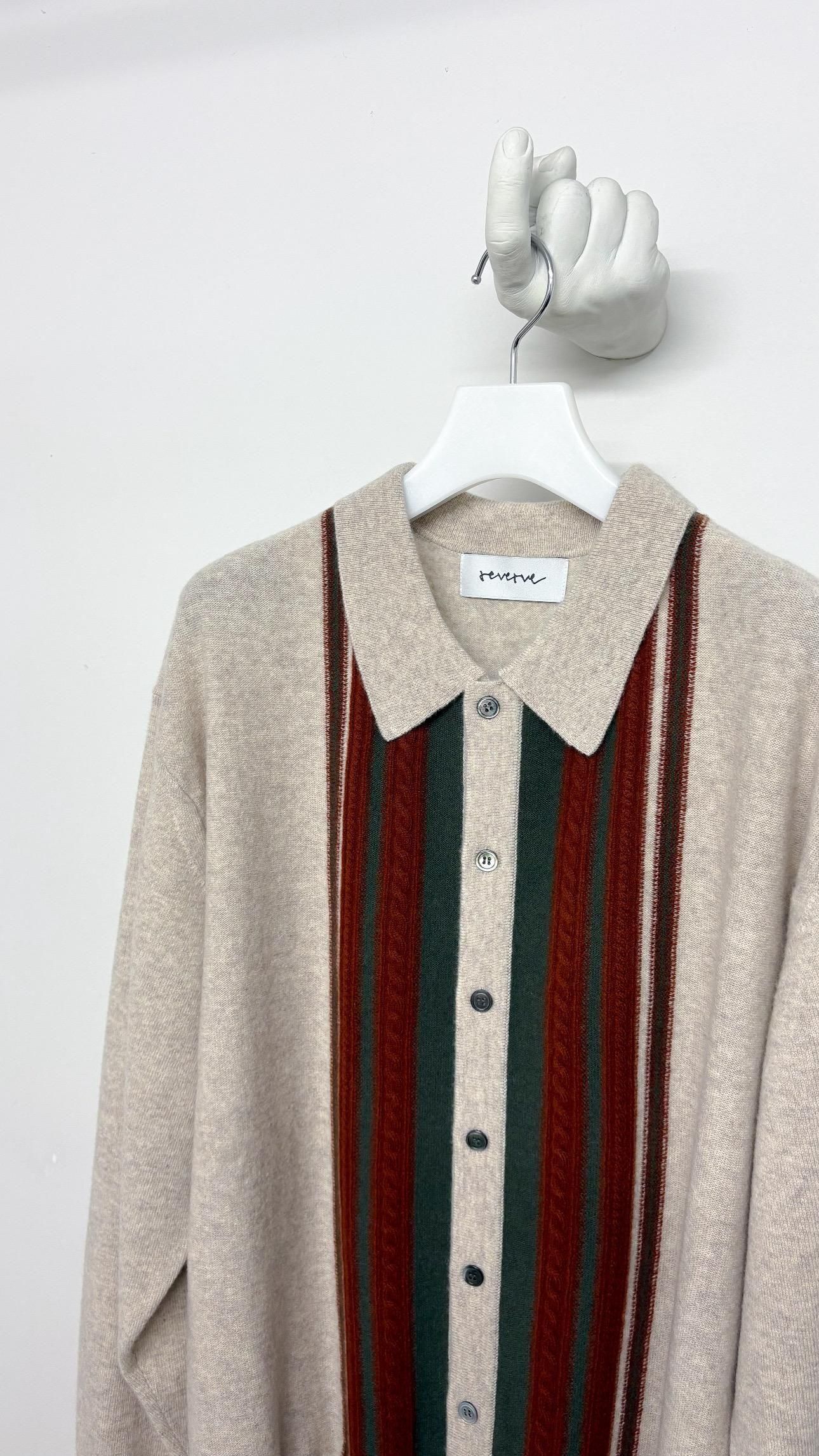 reverve Cable Intarsia Knit Shirt 26,400円(税込) カラー BEIGE サイズ L Soldout SOLD OUT サイズ L 着丈:約63.5cm 身幅:約64cm 肩幅:約57cm 袖丈:約60cm 素材 ウール 100% 中央のケーブル編みがわずかに立体感を生み、 両サイドのインターシャがリズミカルな陰影を描く。 襟付きの端正なシルエットながら、どこか柔らかく肩の力が抜けた表情。 一枚で主役になる存在感と、アウターの中でも映えるバランス感を両立した一着。