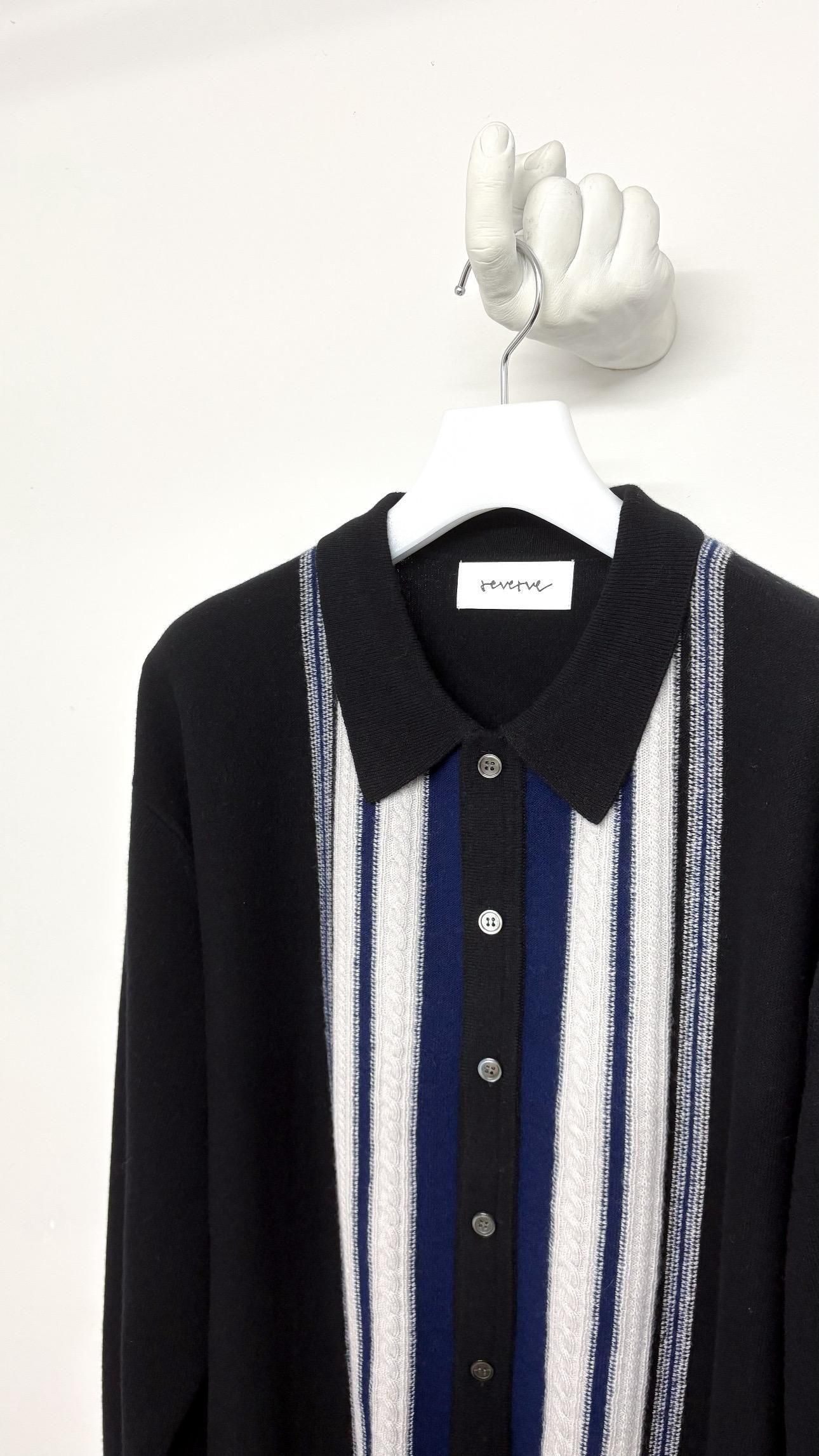 reverve Cable Intarsia Knit Shirt 26,400円(税込) カラー BLACK サイズ L カートに入れる サイズ L 着丈:約63.5cm 身幅:約64cm 肩幅:約57cm 袖丈:約60cm 素材 ウール 100% 中央のケーブル編みがわずかに立体感を生み、 両サイドのインターシャがリズミカルな陰影を描く。 襟付きの端正なシルエットながら、どこか柔らかく肩の力が抜けた表情。 一枚で主役になる存在感と、アウターの中でも映えるバランス感を両立した一着。