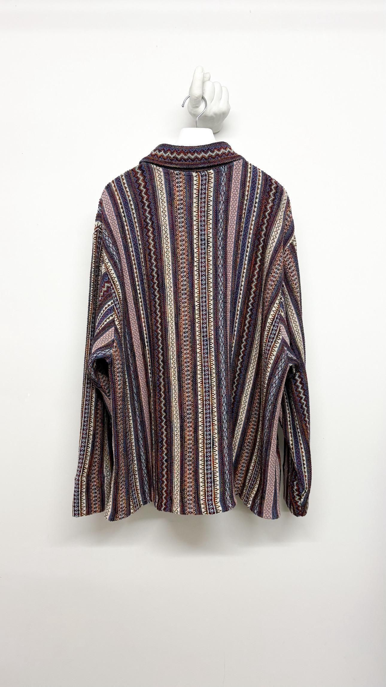 多色の糸を組み合わせ、複雑なリズムで編み上げたマルチジャカードジッププルオーバー。