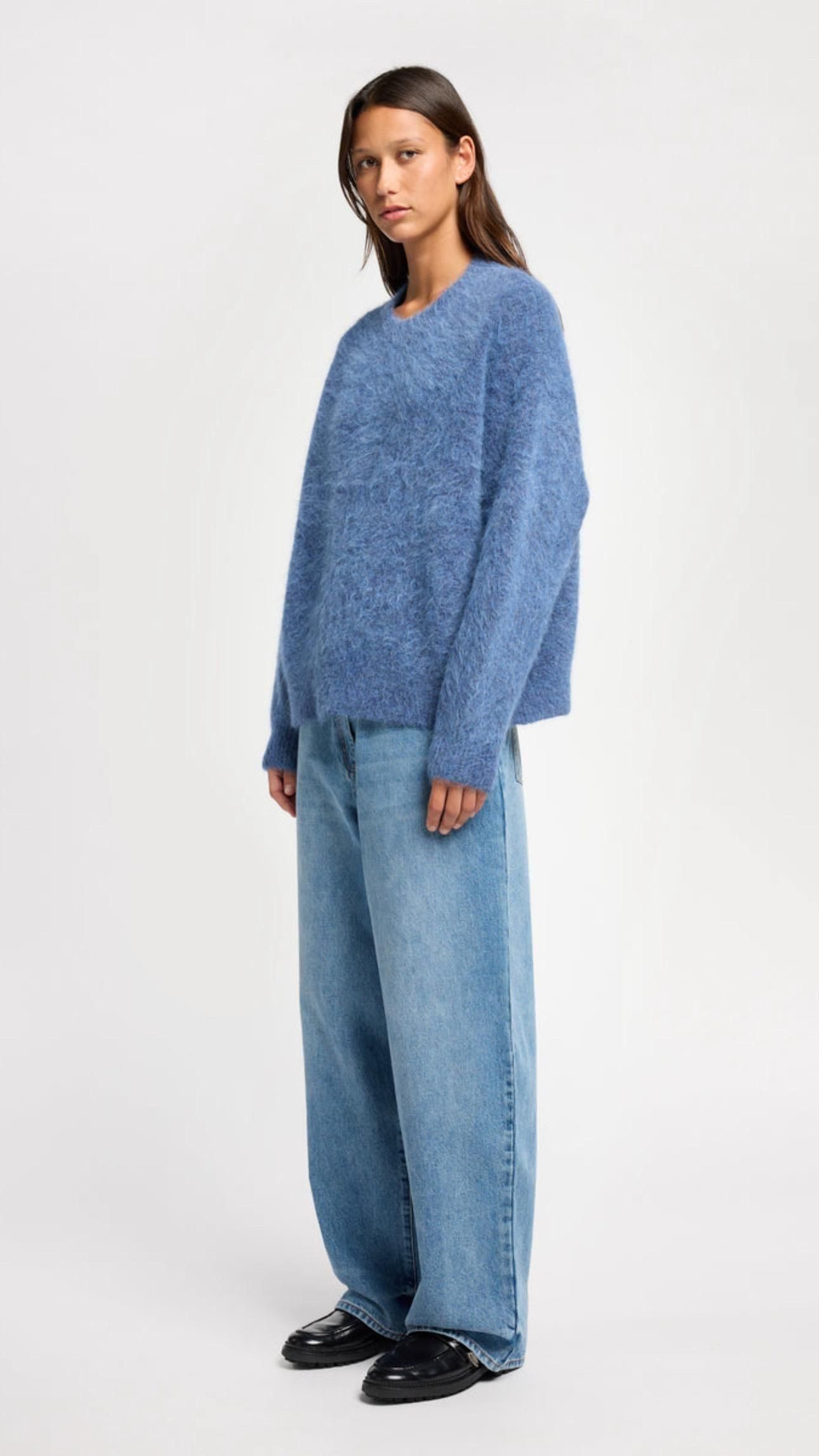 インディゴマールとブラックアルパカが絶妙に調和した、ローレルクルーネックセーター。