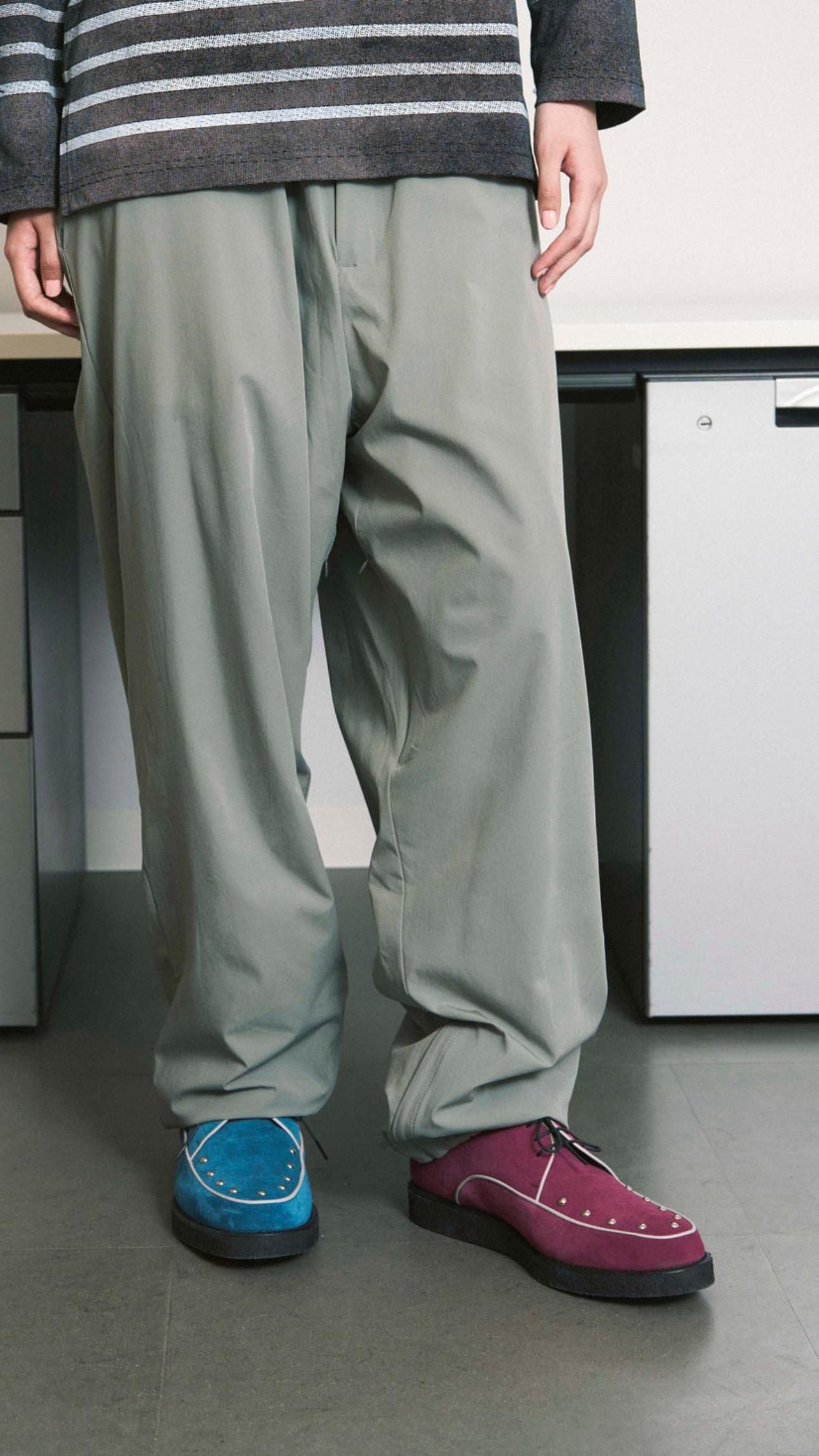 シワの起きにくい素材なのでテックパンツというよりも、クリースの無いスラックスのようなドレッシーな雰囲気で、機能的でありあがらとてもファッショナブルです。