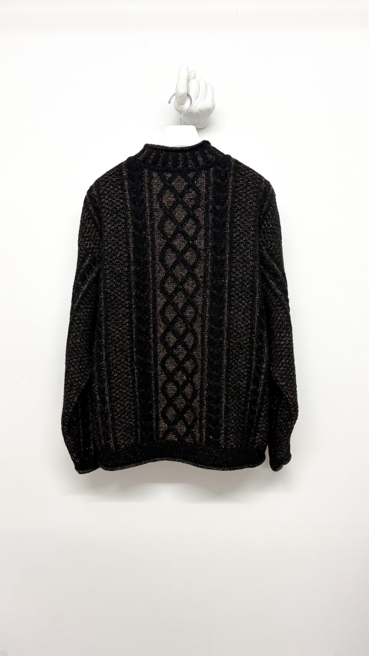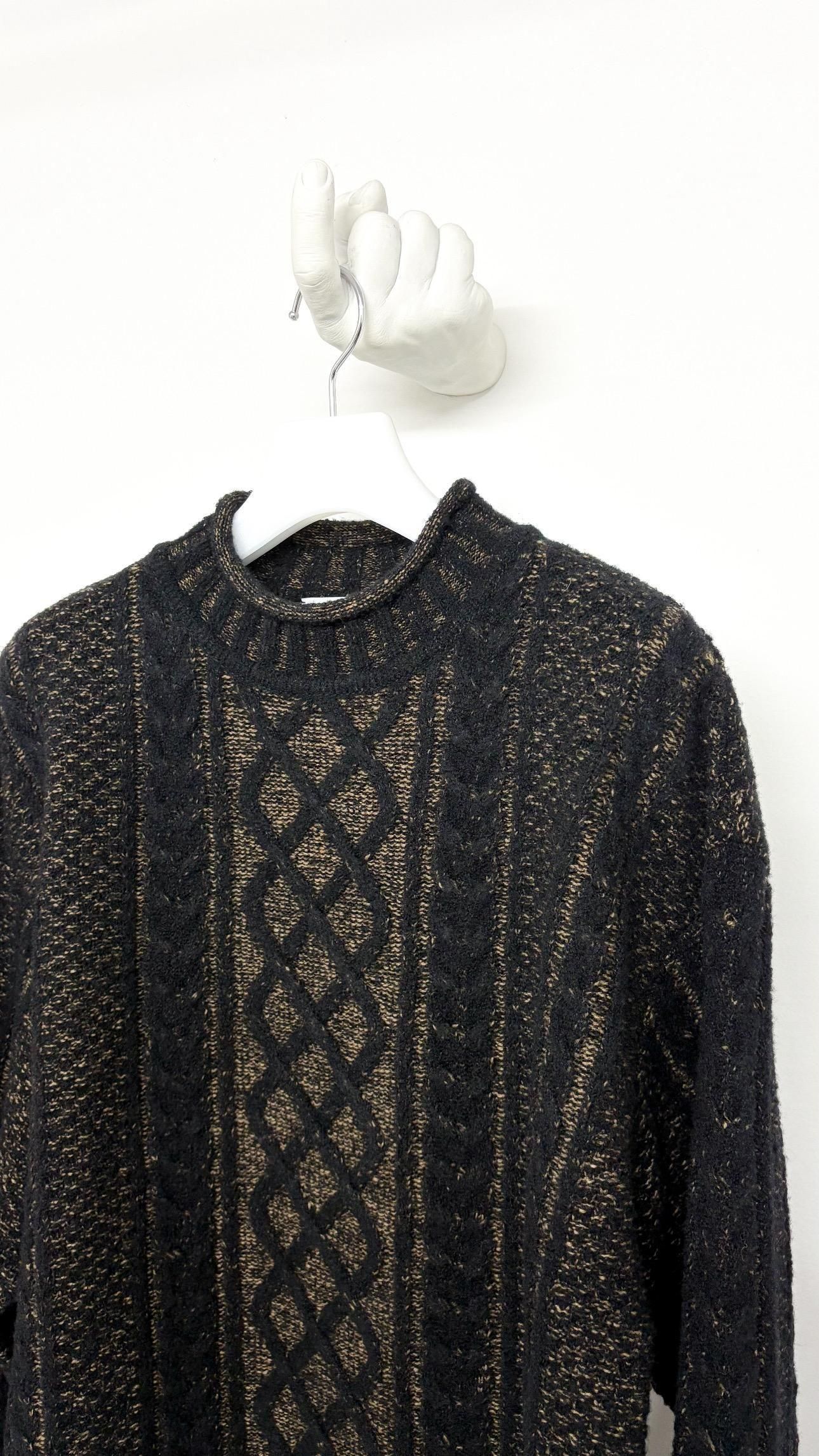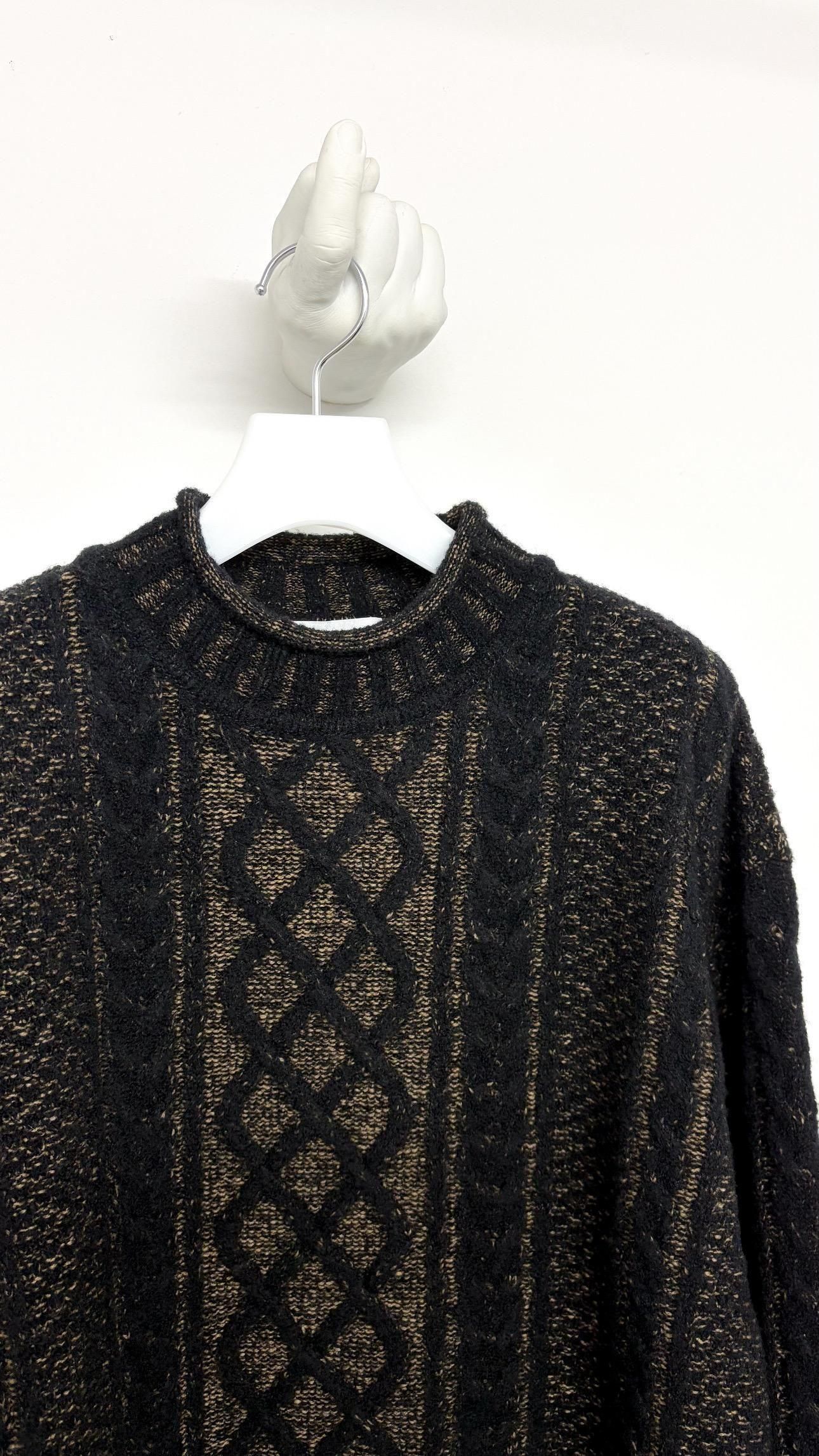reverve Cable Knit Sweater 30,800円(税込) カラー BLACK / BROWN サイズ M カートに入れる サイズ M 着丈:約64cm 身幅:約58cm 肩幅:約57cm 袖丈:約56cm 素材 ウール 90% ナイロン 10% クラシックなケーブル編みをベースに、表面をふっくらと起毛させた温かみのあるウール混ニット。 編み柄は中央にダイヤ模様を配置し、両サイドにケーブルを走らせることで、立体的な陰影と上品な存在感を演出。 ゆとりを持たせたシルエットで、一枚着としてもアウターインにも対応できる万能な一着。