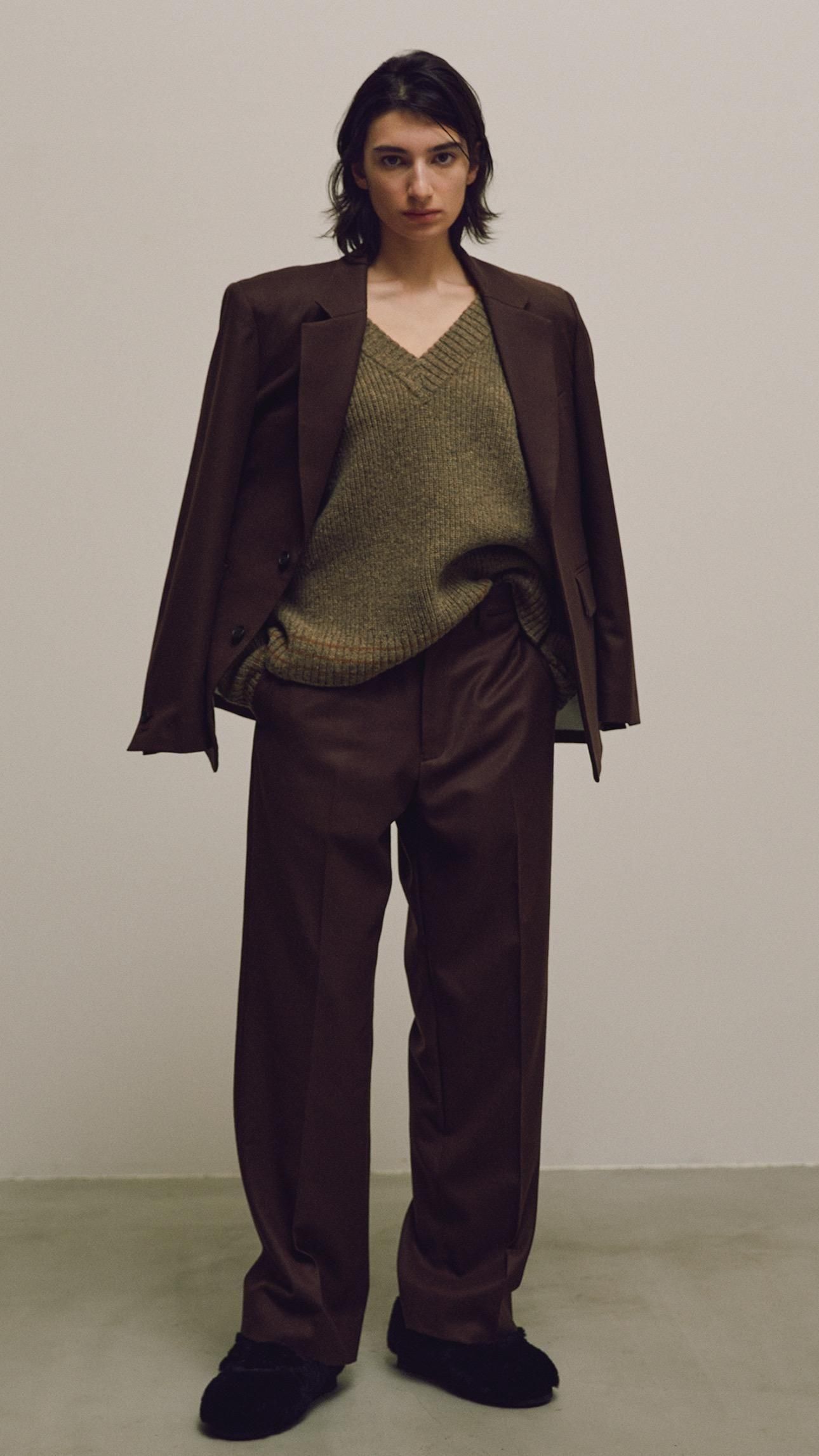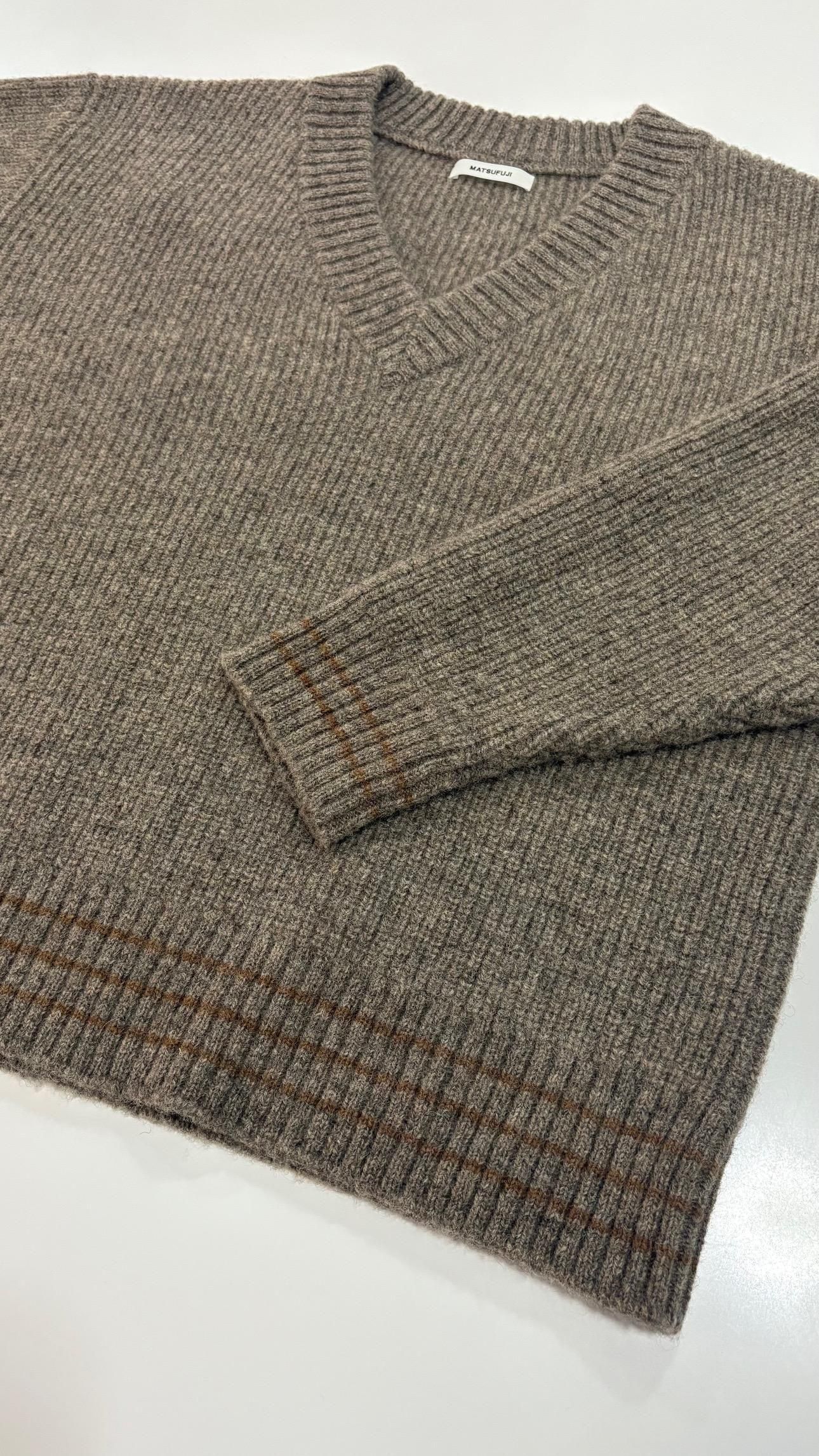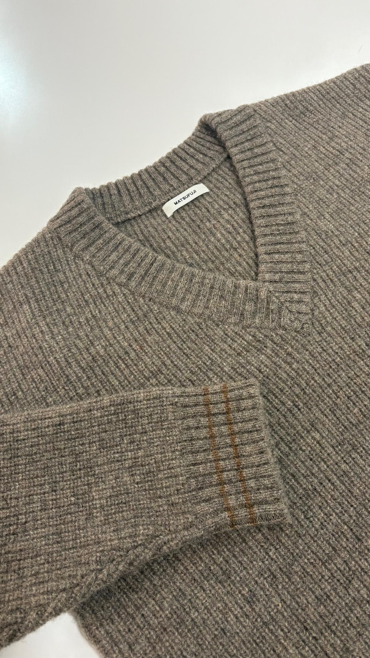MATSUFUJI Wool V-neck Knit 44,000円(税込) カラー BEIGE / BROWN サイズ 3 カートに入れる サイズ 3 着丈:約63cm 身幅:約60cm 肩幅:約51cm 袖丈:約58cm 素材 ウール 100% 片畦編みの深いVネックニット 袖口と裾にライン 着丈短めのシルエット
