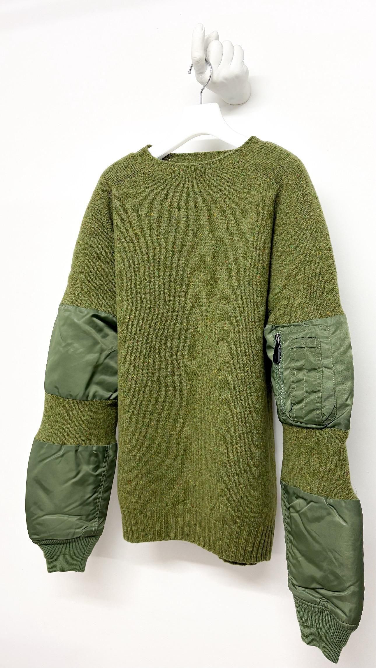 BLESS Bomber sleeve sweater 133,100円(税込) カラー GREEN サイズ OS カートに入れる サイズ OS 着丈:約73cm 身幅:約61cm 裄丈:約95cm 素材 本体:ウール 100% 袖表地:ナイロン 100% 袖裏地:ポリエステル 100% 詰物:ポリエステル 100% リブ:アクリル 100%